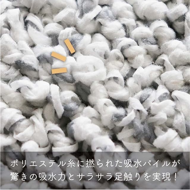 Hitohiraバスマットは、ポリエステル糸に撚られた吸水パイルが、驚きの吸水力とサラサラの足ざわりを実現します。