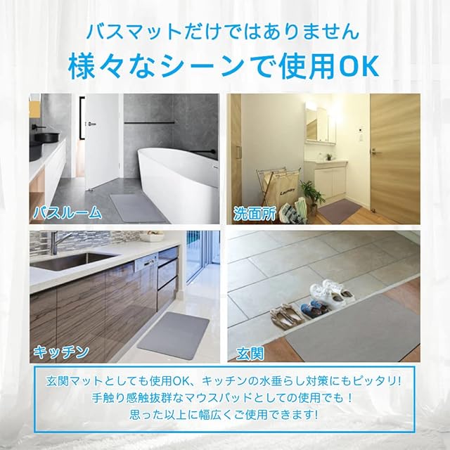 【吸水性・速乾性・滑り止め】 ソフト珪藻土バスマットは珪藻土の驚きの超吸水力を持ち、お風呂あがりの濡れた足元の水滴も逃さず吸収します。超極細繊維PU透水層は通気性が良く、表面の水分が急速に蒸発し、いつもサラッと快適な使い心地!速乾性に優れているので、湿気による細菌の繁殖も抑えます。珪藻土マットの裏面は強力な滑り止めを施しているので、小さいお子様からご年配の方まで幅広くご利用いただける安心安全な商品です。浴室、脱衣所、洗面所、キッチンや玄関などの場所で安心使用できます。(注意:瞬間吸収とは、濡れた足または濡れた靴を踏んだ後に吸収する時間のことで、完全に濡れて洗浄した後、2-3時間乾かす必要があります。)