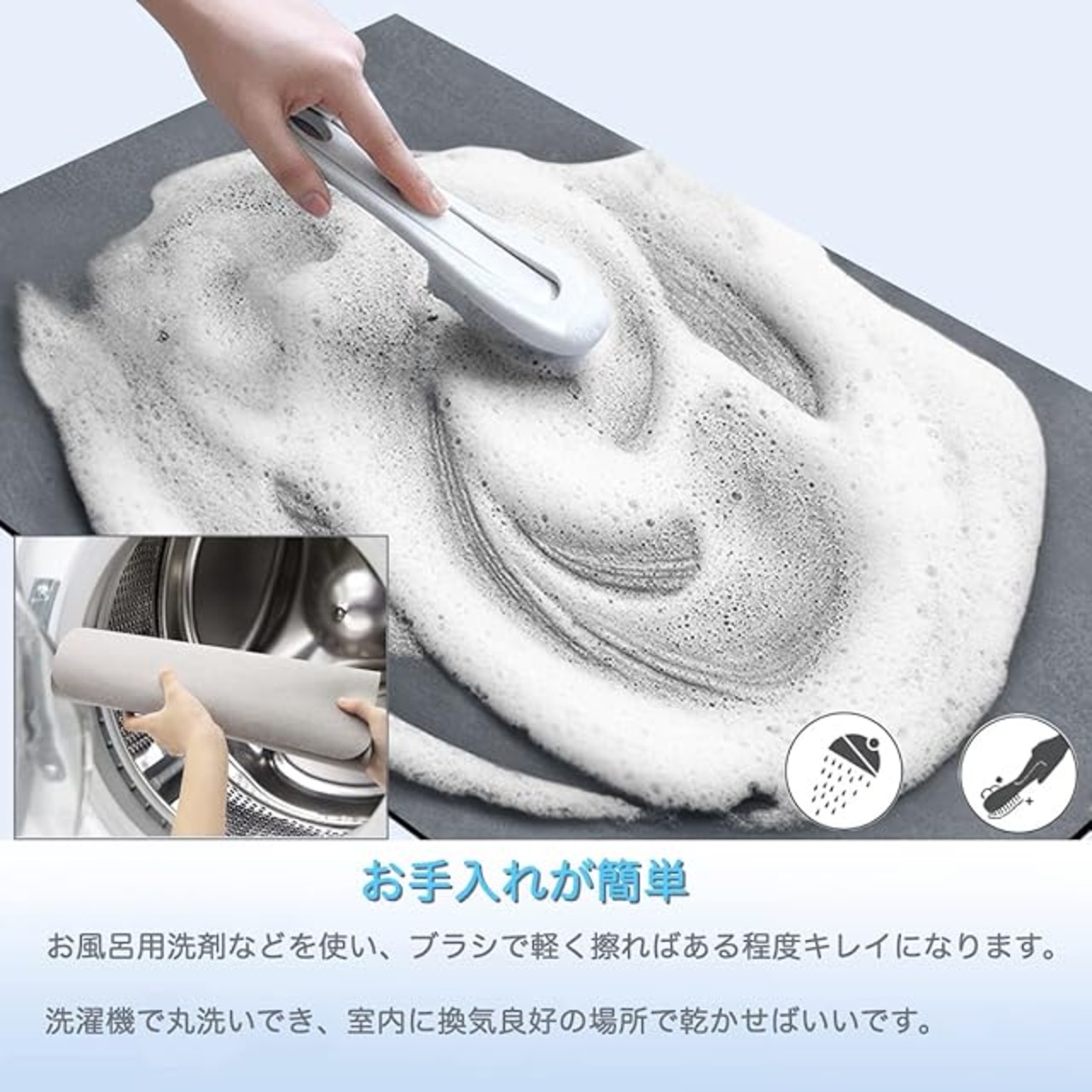 【水洗いと洗濯機で丸洗い対応】 バスマットの表面が汚れたら、水で洗い流すだけで十分です。干す場合は、陰干しがおすすめです。面倒を感じる時に、洗濯機を使用して丸洗いも可能で、吊るして乾かしたりすることができます。タオルタイプよりソフト珪藻土マットはお手入れ簡単、ホコリを溜めず、髪の毛を取り込まず、水を掛けながら軽くブラシで擦ればある程度キレイにはなります。抗菌、消臭、防カビ効果を実現します。硬いタイプよりソフト珪藻土バスマット一切割れず、冷たくない、カビを削る作業も不要です。正し使えば、珪藻土バスマットの寿命も延び、長く使えます。