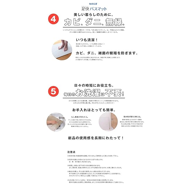✅なのらぼバスマット165万枚販売達成。 ✅【製品の紹介】 安心・安全、国産素材&日本製の珪藻土バスマット『足快(そうかい)バスマット』です。 踏むだけで足の裏の水分を吸いつくように吸収します。 バスマットの上は常にカラッと快適。湯上りの足は、いつもさらさら爽快です。 布製マットのびしょびしょした不快感や毎日の洗濯の手間を一挙解決してくれます。 また、布では防ぎにくいカビの発生やダニや雑菌の繁殖を許しません。 足快バスマットは、建材メーカーであるMUマテックス株式会社が珪藻土を独自の技術で進化させた高品質の珪藻土バスマットです。 ✅ 原料も国産の珪藻土を使用しており、製造も全て日本で行われていますので、安心・安全です。 その他主原料のものや海外産の珪藻土を使用した他社の製品に比べ、吸水性・速乾性も抜群に優れています。 【使用上の注意】 床下収納・マットなどの上でのご使用はお避け下さい。 必ず、ロゴが入っている面を上にし、平らな場所でご使用ください。 ✅ 耐久重量は最大約130kgまでとなっておりますので、 数人で一度に乗る事や、飛び跳ねる事は避けて下さい。 立て掛けて乾燥させると、倒れて割れる場合がございますので、 安全な場所で乾燥をさせて下さい。