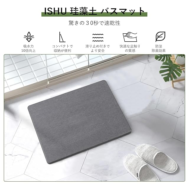 商品名:ISHU ハード バスマット 珪藻土バスマット速乾 大判 足拭きマット お風呂マット 洗える 珪藻土マット 抗菌 防臭 滑り止め付き 浴室 洗面所 大きめ 一枚物 (30*40*0.9CM) ダークグレー