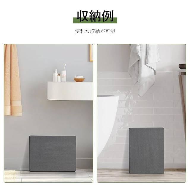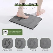 『珪藻土(けいそうど)は』、珪藻という植物プランクトンが堆積し、長い年月をかけて化石化したものです。珪藻土には、極めて小さな孔がたくさん開いているため、吸水性・吸湿性に優れています。 吸い込んだ水分や湿気は、自立呼吸という性質によって放湿されるため、珪藻土は速乾性も優れています。 珪藻土は、日本では昔から、七輪や壁の材料として使われてきた歴史があります。近年になり、優れた吸水性・速乾性から「洗濯しなくて良いバスマット」として、珪藻土を利用したバスマットは人気と注目を集めています。 『通常のバスマットと珪藻土バスマットの違い』通常のバスマットは、気を付けて使わないとビショビショになってしまうことがありますが、珪藻土バスマットは水に濡れてもすぐに乾きます。体を拭かないままバスマットに乗っても、珪藻土バスマットならすぐにサラサラの使い心地の表面に戻ります。 珪藻土バスマットは、特別なお手入れが必要ありません。使用後に立てかけて乾かすだけで良いので、日常的なお手入れは不要です。使用後に毎回、洗濯をする必要もありません。 通常バスマットは、濡れた状態が長くなると、カビや雑菌が繁殖しやすい環境になります。これは、カビや雑菌が水分のある環境を好むことが原因です。珪藻土バスマットは、吸い込んだ水分を外に逃がす自立呼吸の性質があるため、雑菌やカビが繁殖しにくいバスマットと言えます。 水虫菌(白癬菌)もカビの一種なので、珪藻土バスマットは水虫菌の繁殖がしにくいバスマットでもあります。家族でバスマットを共有している場合や、水虫菌が気になる人にも、珪藻土バスマットはおすすめです。