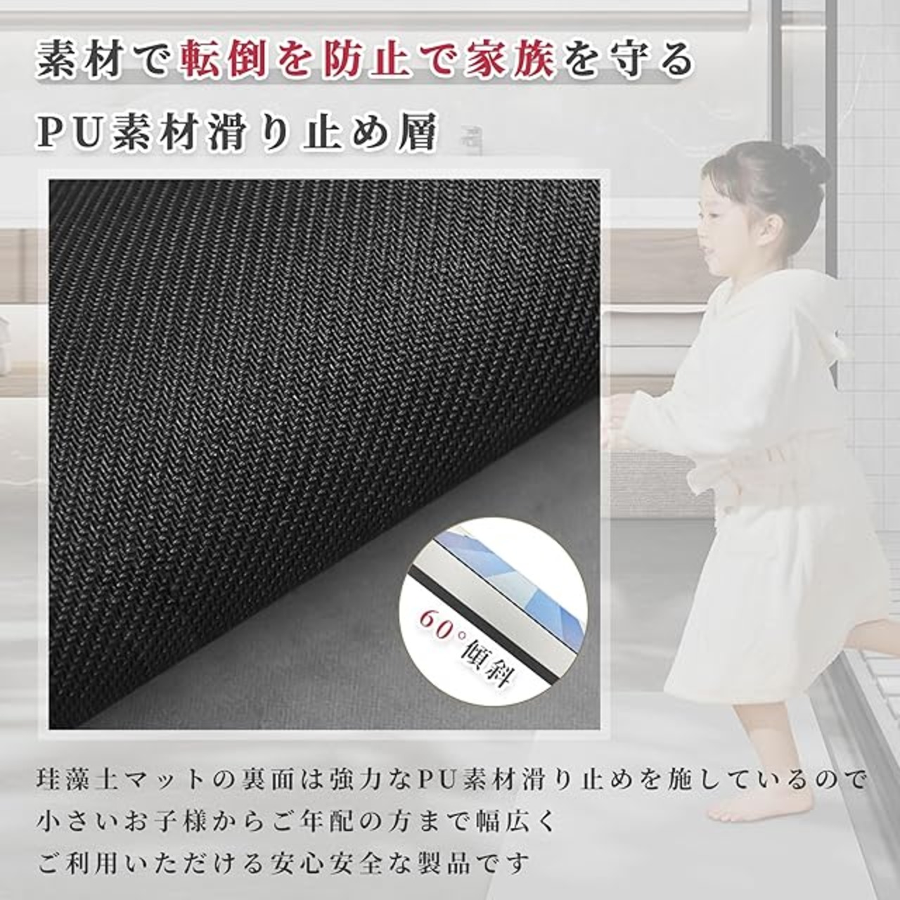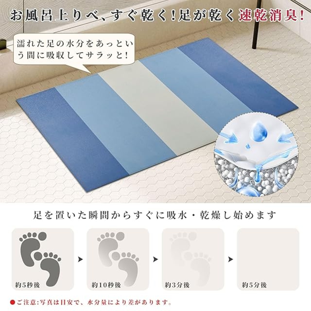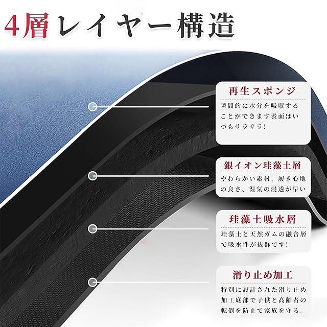 【高い吸水力·10秒で速乾】吸水量は従来の珪藻土の約2倍!超極細繊維PU透水層は通気性が良く、表面の水分が急速に蒸発し、速乾性に優れているので、湿気による細菌の繁殖も抑えます。従来の珪藻土に満足出来なかったお客様もきっとご満足頂けます。