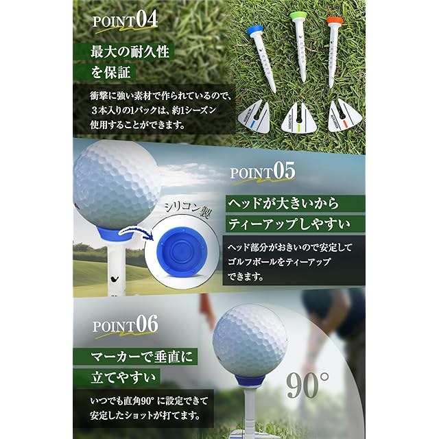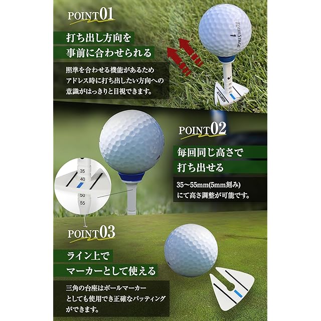 Alta Green最新ゴルフ用ティー 『アジャスティー』 インテリジェントなデザイン: このゴルフティーセットは革新的な2つのパートで構成されています。メモリのついたティーとマーカーとしても使えるプレートがセットに含まれています。これにより、ゴルフプレイ中にティーやマーカーを探す手間を省き、スムーズなゲームプレイを実現します。 高さ調整で理想のスイング: 好みの高さでゴルフをプレイしたい方に最適なティーセットです。プレートを簡単に挿入して、55、50、45、40、35、30の6つの異なる高さから選ぶことができます。一定の高さでスイングすることで、一貫性のあるゴルフプレイを実現します。 カラフルな3つのセット: 鮮やかなカラーバリエーションが特徴のこのゴルフティーセットは、青、オレンジ、緑の3つのカラーがセットに含まれています。個性を表現しながら、ゴルフプレイをより楽しむことができます。 マーカーとしても利用可能: プレートはマーカーとしても使用できます。また、プレートにはラインが書かれており、アラインメントの調整に便利です。プレートを外せば、通常のティーとしても使用できますので、さまざまなゴルフシーンに対応します。 便利なサイズと持ち運び: プレートを外すと、通常のティーやマーカーとして使用できます。コンパクトなサイズなので、ゴルフバッグに簡単に収納することができ、持ち運びも便利です。 この新しいゴルフティーセットは、ゴルフ愛好家にとって革新的な製品です。高さ調整機能やマーカーとしての利用性など、優れた特徴を備えています。さまざまなカラーバリエーションと便利なデザインにより、ゴルフプレイをより楽しく、スムーズに行うことができます。是非、このゴルフティーセットをお試しください。