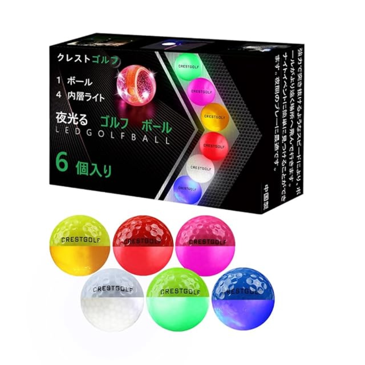 商品名:Crestgolf 光るゴルフボールごるふ人気ぼーる 10-12分間点灯する光るボール 6色セット ゴルフ 練習 夜間発光可能