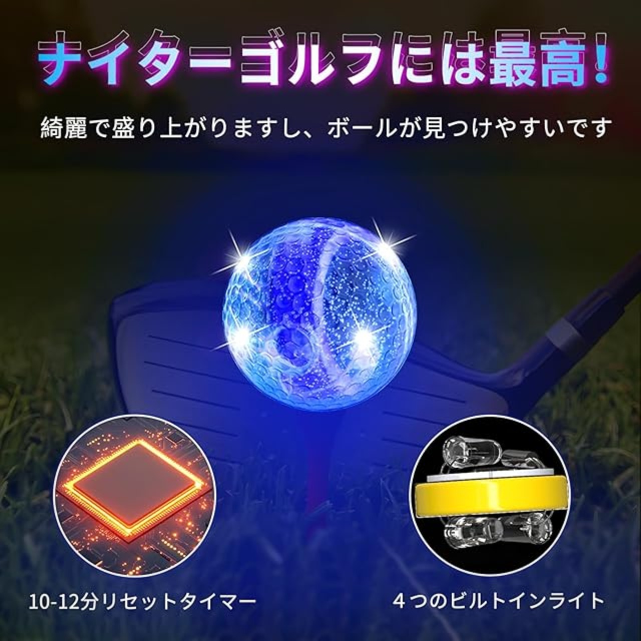 【長時間利用】総発光時間:約50時間。ゴルフ練習ボールは内部にLEDライトが仕組まれており、ボールをクラプで打った瞬間にスイッチがONになって発光します。以前の光るボールは約6~8分間点灯し、アップデート後は約10分から12分間ライトアップし続けます。