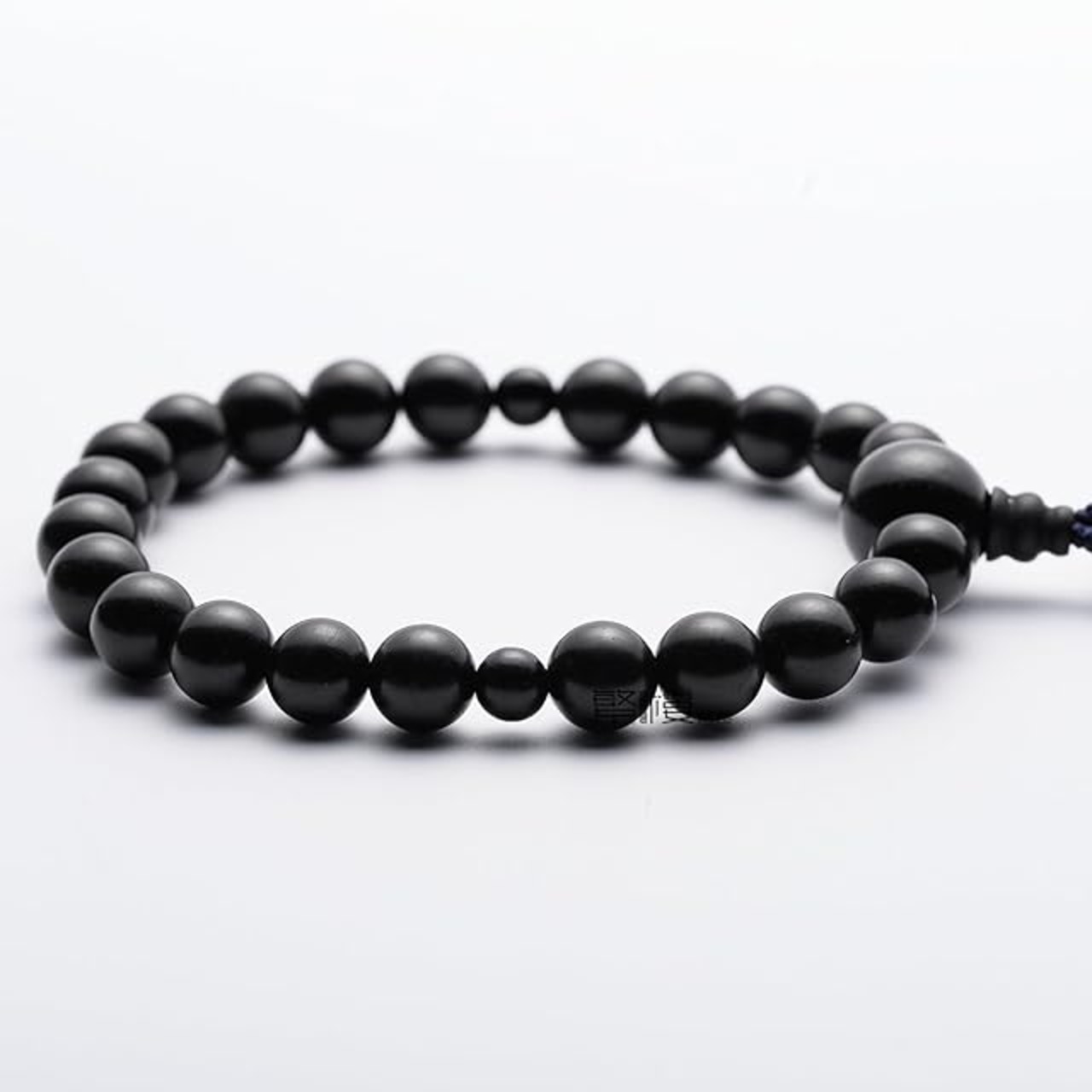 念珠の材料:念珠は全部本場の黒木から作られ、中には18ミリメートルの親珠を1個、12ミリメートルの主珠を22個、また8ミリメートルの天珠を2個含み、共に25個となり、お客様の都合のため、念珠袋(17.5cm*8.5cm)も付けます。