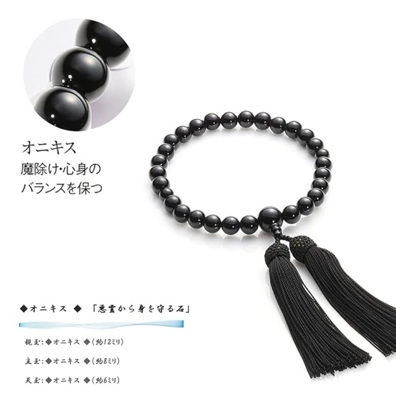 【数珠素材】:●親玉:オニキス(約10ミリ) ●主玉:オニキス(約7ミリ)●天玉:オニキス(約5ミリ)●房の素材:正絹頭付房(黒色)