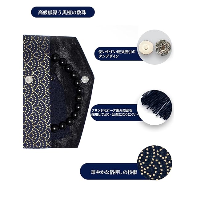 高級黒檀素材で作られた男性用数珠セットは、格式高いデザインで葬儀や法事などの特別な場面に最適です。高品質のタッセルと丈夫な作りで、長くご愛用いただけます。また、8.5cm x 17cmの美しい和柄収納袋がセットされており、数珠を安全に保管でき、持ち運びにも便利です。この数珠は、細部までこだわった職人技で仕上げられており、伝統を感じさせる一品です。