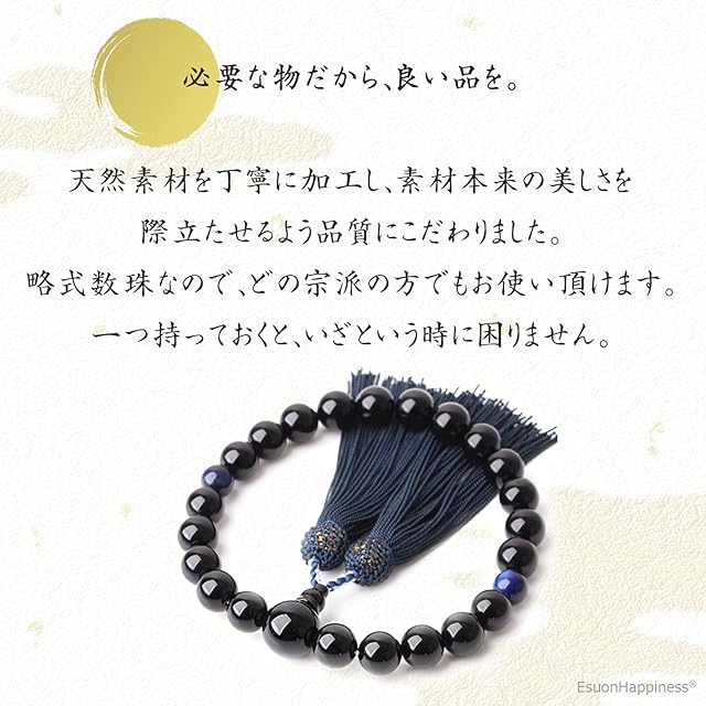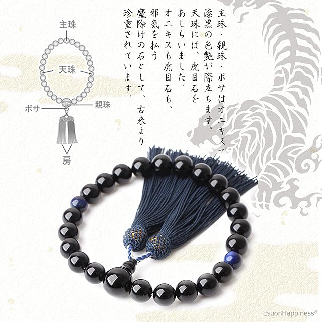 商品名:数珠 男性用 オニキス 12mm 天珠 数珠入れ 付 京都 西陣織 金襴 数珠袋 虎目石 赤虎目石 青虎目石 22玉 すべての宗派で使える 略式 念珠 天然石 頭房 セット(12mm, 天珠青虎目石)