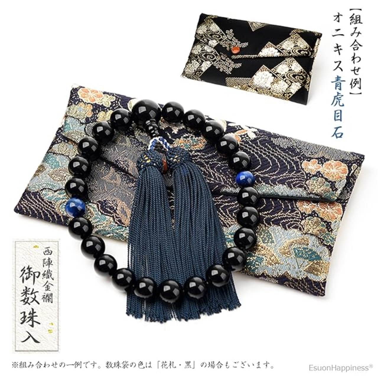 西陣織金襴 数珠入れ付・オニキス12mm玉の数珠。 天然素材を丁寧に加工し、素材本来の美しさが際立つよう、品質にこだわりました。 主珠、親玉、ボサはオニキスで、漆黒の色艶が美しく輝きます。 数珠入れは京都の歴史ある紋織物「西陣織」を使用。 なかでも高級とされる「金襴」生地を使い、職人が丁寧に仕上げています。 なかでも高級とされる「金襴」生地を使い、職人が丁寧に仕上げています。