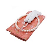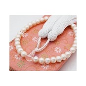 お値打ちな価格の淡水真珠の数珠・念珠です。 真珠のシェープはポテト(楕円形)ですが、粒とカラーをそろえて組み上げていますので温かみのある表情を感じていただけると思います。 お葬式に用いても良いとされている宝石はパール、オニキス、ジェット。 その中でも「涙の象徴」である真珠は、お葬式に最もふさわしい宝石です。 上品でしっとりした手触りで不思議と心が落ち着きます。 お通夜や告別式などの悲しい知らせは突然やってくるもの。 そんな時でも慌ててしまわないように大人のマナーとして きちんと前もって用意しておくことをおすすめします。 念珠(数珠)は貸し借りするものではありませんので 自分の念珠は持っておきたいですね。 念珠さえ用意していれば礼を欠くことはありません。 念珠は一連のものであれば宗派を問わずお使いいただけます。