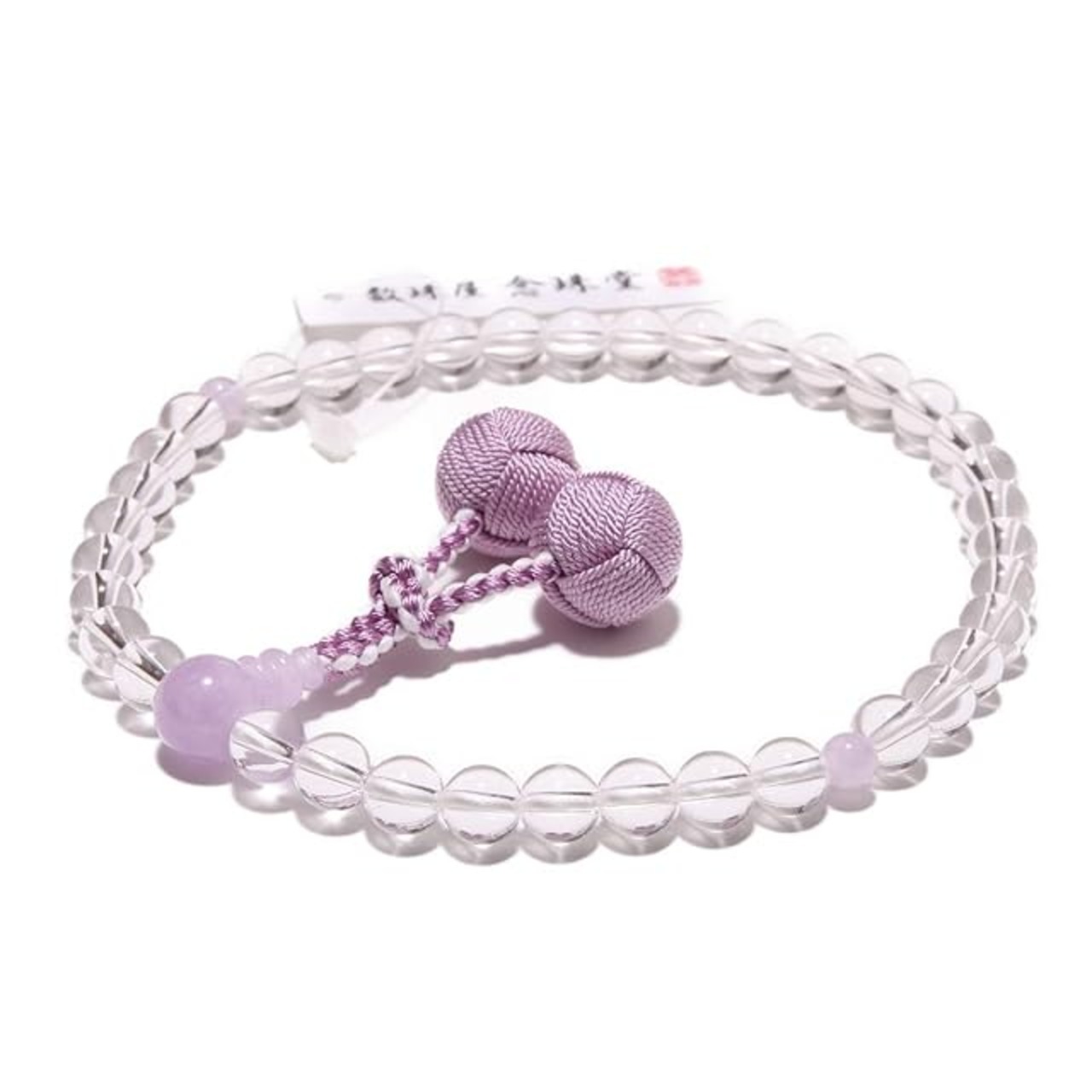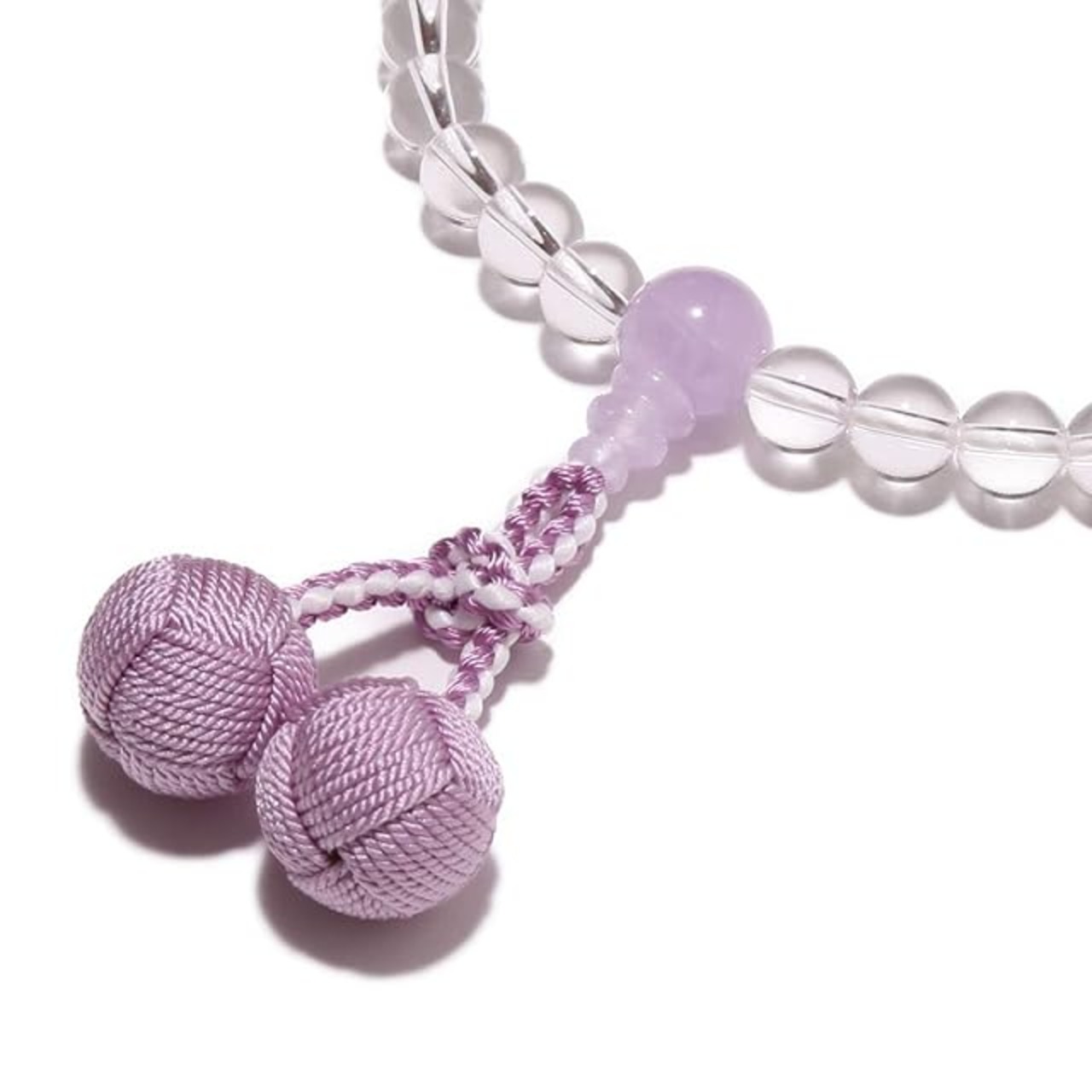 ▼ 安心の日本製数珠 ▼ 創業80余年の歴史ある数珠メーカー「念珠堂」が製造いたします。熟練数珠職人が丹精込めて仕立てた逸品をお届け致します。冠婚葬祭どの様な場でもお使い頂ける数珠でございます。<br><br>▼ 商品の特徴 ▼ 無色透明の本水晶を使用した女性用数珠です。アクセントに藤雲石(とううんせき)をあしらいました。淡い藤色の藤雲石は、その印象のとおり心に安らぎをもたらしてくれる「癒しの石」とも言われております。房は型崩れする心配が無い、丈夫で扱いやすい房でございます。高級素材の絹100%できた正絹房を使用しております。<br><br>▼ すべての宗派でご使用可能 ▼ 天台宗、浄土宗、真言宗、浄土真宗、日蓮宗、曹洞宗、臨済宗、などその他全宗派に対応 ※珠の大きさによって男性用数珠と女性用数珠に分けられ、男性は大きい珠の数珠を、女性は小さい珠の数珠を使うのが一般的です。<br><br><数珠袋付き>携帯に便利な数珠袋をお付けさせて頂きます。金具で開閉するタイプですので片手で簡単に開いて、しっかり閉じる、使い勝手の良い数珠袋です。<br><br><念珠堂製作証明書カード付> 念珠堂が製作した事を証明するカードをお付け致します。主玉:本水晶 7mm、天玉:藤雲石5mm、親玉:藤雲石10mm、房:絹100%の正絹房
