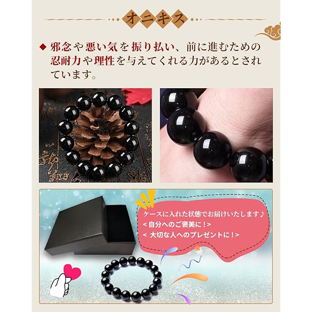 オニキスは自分自身の中心軸をしっかりと安定させる石で、着実に目標を実現するために地に足を着けた行動をするよう導いてくれる石です。また、人生において幾度も降りかかる辛い場面、苦しい 面においてもあきらめず、前に進むための忍耐力や意思の強さを与えてくれる石です。