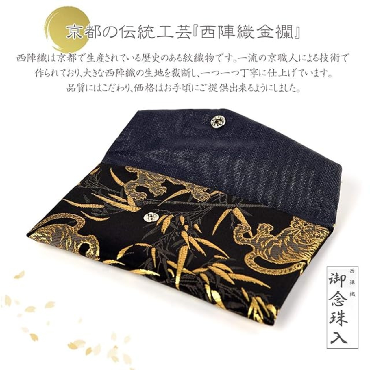 商品説明 江戸時代より引き継がれてきた、京都の伝統工芸 西陣織高級金襴を使用し、一流の京職人による手 作りの高級数珠入れ。<br> 手作りのため、小花の柄は異なる場合がございます のでご了承ください。