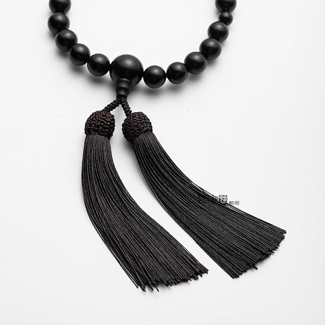 ❥念珠の材料:念珠は全部本場の黒木から作られ、中には18ミリメートルの親珠を1個、12ミリメートルの主珠を22個、また8ミリメートルの天珠を2個含み、共に25個となり、お客様の都合のため、念珠袋(15cm*9.5cm)も付けます。