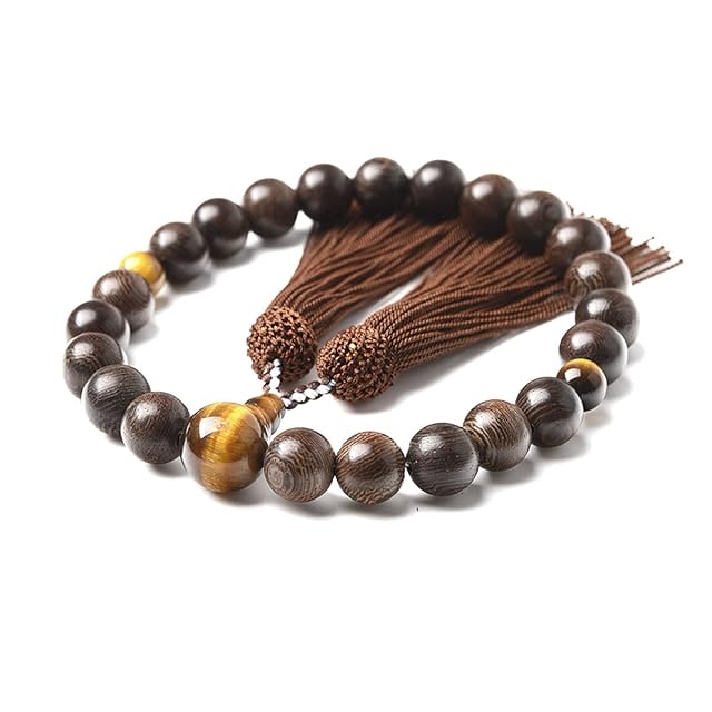 [EsuonHappiness] 数珠 男性用 13mm 親玉天然石 16mm 数珠袋 付き 西陣織金襴 念珠 天然石 天然木 略式数珠 数珠入れ 黒檀 朱檀 本桑 虎目石 茶水晶 (天然石16mm親珠, 本桑/虎目石)