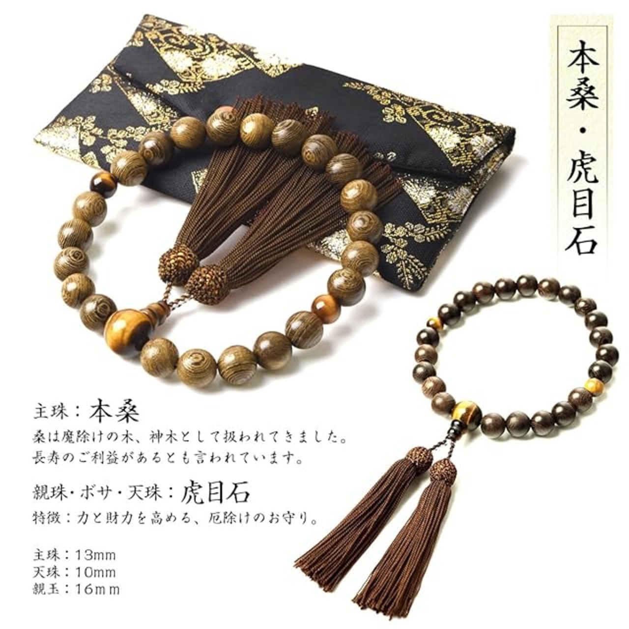 商品名:[EsuonHappiness] 数珠 男性用 13mm 親玉天然石 16mm 数珠袋 付き 西陣織金襴 念珠 天然石 天然木 略式数珠 数珠入れ 黒檀 朱檀 本桑 虎目石 茶水晶 (天然石16mm親珠, 本桑/虎目石)