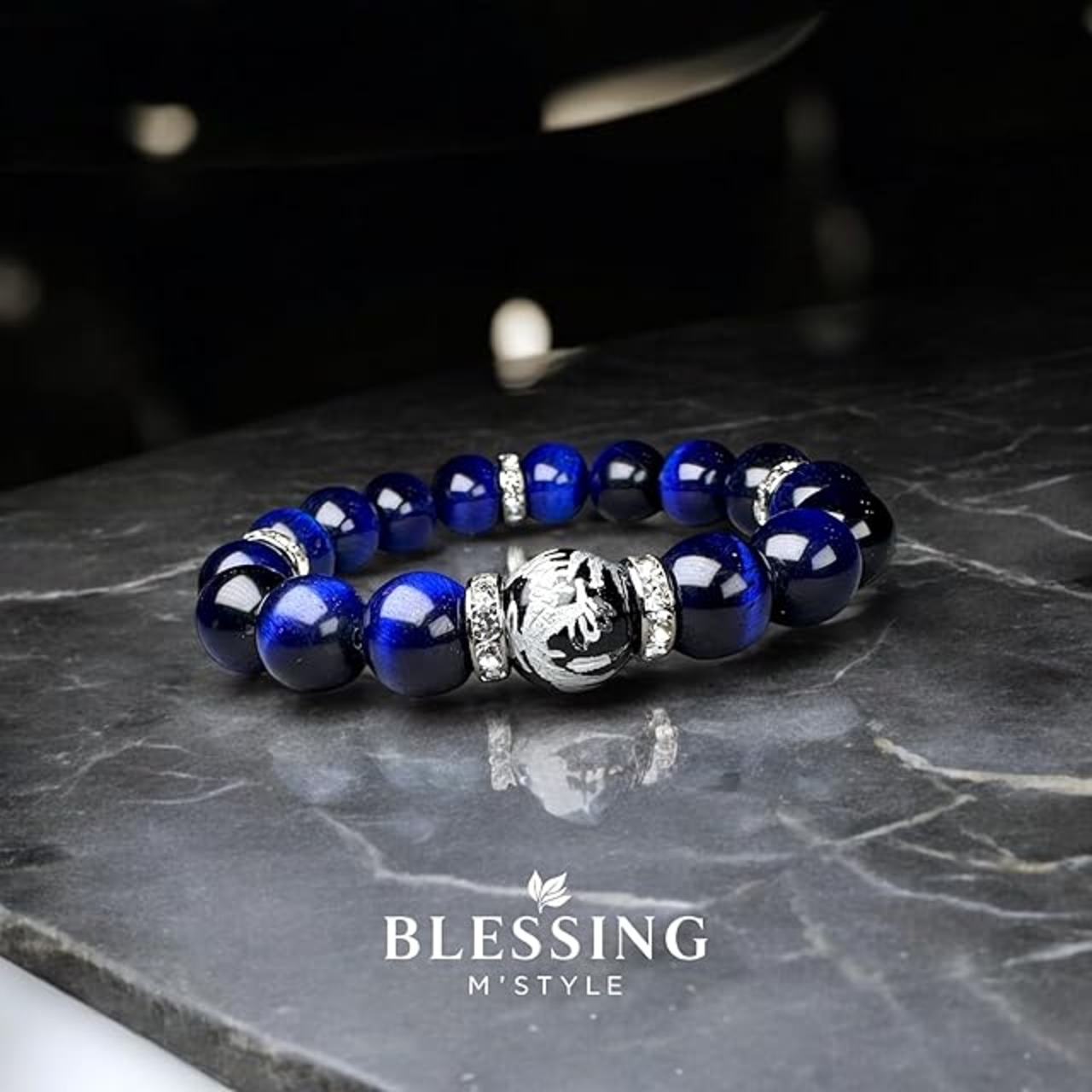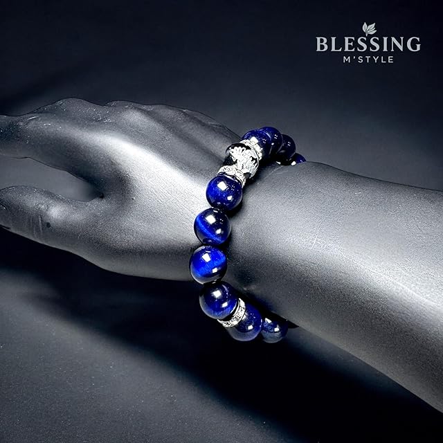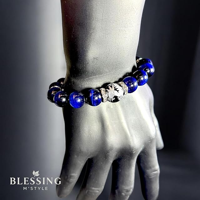 [BLESSING M'style] 天然石 パワーストーン ブレスレット メンズ 決断前進の石 ブルータイガーアイ ラピスカラー 五爪皇帝龍銀彫り オニキス パワーストーン ブレスレッド ロゴ入り スエード調高級巾着袋付き