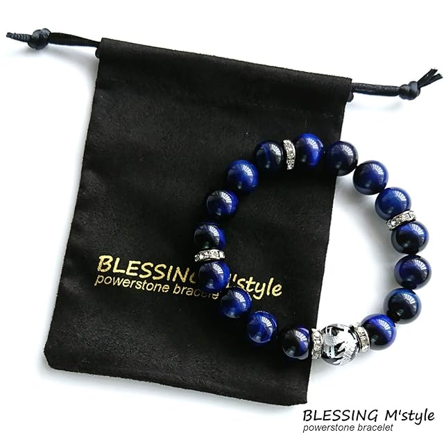 商品名:[BLESSING M'style] 天然石 パワーストーン ブレスレット メンズ 決断前進の石 ブルータイガーアイ ラピスカラー 五爪皇帝龍銀彫り オニキス パワーストーン ブレスレッド ロゴ入り スエード調高級巾着袋付き