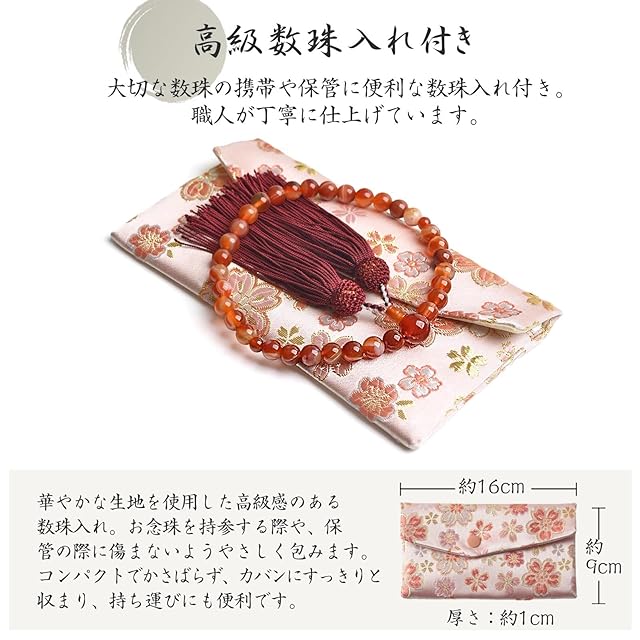 [EsuonHappiness] 数珠 女性用 紅縞瑪瑙 赤メノウ 8mm 高級サードオニクス カーネリアン レッドメノウ 頭房 念珠 略式 宗派共通 天然石 数珠入れ 専用袋付き