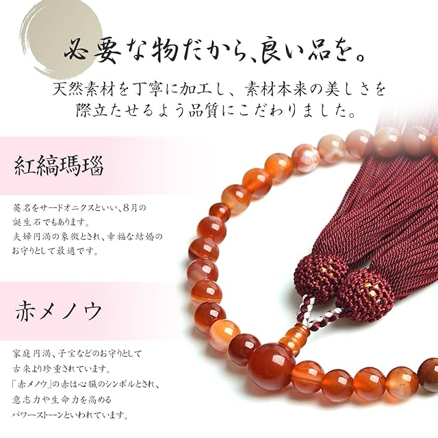 商品名 【数珠袋付き】数珠 女性用 紅縞瑪瑙 赤メノウ 8mm 西陣織 金襴 数珠袋 付き サードオニクス カーネリアン レッドメノウ 数珠入れ 頭房 念珠 お数珠 略式 宗派共通 天然石 juzu01 素材 主珠:紅縞瑪瑙 約8mm 親珠:赤メノウ 約12mm 天珠:赤メノウ 約6mm ボサ:赤メノウ 房:頭房 宗派 どの宗派の方でもお使い頂けます 特典 高級数珠入れ付 注意 ・できる限り、実際の商品の色合いに近い状態で撮影しておりますが、パソコン、モニターの環境によって実際の商品と写真の色合いが多少異なって見える場合もございます。 何卒ご理解、ご了承下さいませ。 ・当店で取り扱う天然石は、できる限り品質の良いものを選び、ご提供しておりますが、 天然石は長い年月をかけて自然にできた鉱物ですので、鉱物が生成される過程で取り込んだ特有のインクルージョン(内包物)が、ヒビや曇り、色むら、僅かな傷に見えることがございます。 天然木は、採取の時期により色味や木目の出方が異なります。 ひとつとして同じ物はございませんので、掲載写真と同一の商品をご提供することは不可能です。 また、天然石や天然木の色味のご指定を承ることも致しかねます。 これらは天然素材の証しであり、不良品ではございませんので、返品・交換はお受けすることは出来ません。