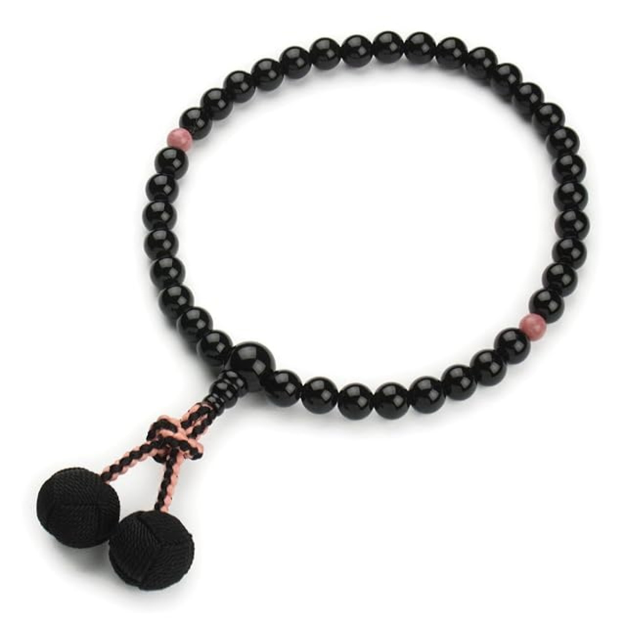 創業80余年の老舗数珠メーカー「念珠堂」が製造する安心の日本製数珠。<br>熟練数珠職人が丹精込めて仕立てた逸品をお届け致します。<br><br> 艶やかな漆黒が美しい黒オニキスに紅簾石(こうれんせき)をあしらった女性用お数珠です。<br>葬式や法事などフォーマルの場で違和感なくお持ち頂けます。<br>シックな中にも可愛らしさを兼ね備えたお数珠に仕立てました。<br><br>この房はバッグに入れたままでもクシャクシャになる心配がなく、丈夫で扱いやすい房でございます。<br><br>携帯に便利な数珠袋をお付けさせて頂きます。<br><br>全ての宗派でお使い頂けます。<br><br>主玉:黒オニキス7mm、二天玉:紅簾石 5mm、親玉:黒オニキス10mm、房:正絹小田巻梵天房