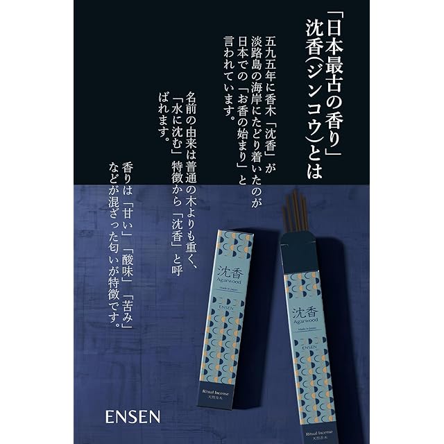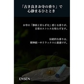 【 ENSEN(エンセン) 】は日本の“香りブランド”です。 こころ、安らぐ「こだわり」の名香をあなたに。 日本人ならではの繊細な感性と技術を大切にした香りが、 日々の疲れた心と身体を癒します。 香りがあなたに「ゆとりある生活」を届けます。 【 ココがちがう★3つのポイント★ 】 1.最高級タニ沈香と漢薬が生み出す「日本最古の香り」 2.天然香料100%使用 3.お香を知り尽くした、熟練職人による逸品 【 沈香の特徴は? 】 ▼香りは? 沈香の香りは、甘さと酸味のある香木ならではの香りです。 【 心と体を整える、自然100%の力 】 ▼複数の高級な生薬が本格派の香りを生み出します。 【 素晴らしい“一日のスタート”に 】 ●窓を開け放ち、お香とともに「空間の浄化」に ●「お部屋や玄関、トイレ」などの掃除後の消臭に ●朝晩の「お仏壇用」に ●「和室や事務所、神棚」などに 【 リラックス&リフレッシュに 】 ●「ヨガや瞑想、座禅」の精神統一に ●「在宅ワーク」の気分転換に ●「就寝前」のひとときに ●「梅雨時」の湿気対策に 【 清々しい香りの変化を味わえる 】 ●上匂い(うわにおい) 火をつける前の香りは漢方のキリっとした香り ●焚き香(たきが) 燃焼中は伝統的な「和の香り」 ●残り香(のこりが) 燃焼後は荘厳な香りが数時間程度楽しめます。 【 お香の楽しみ方 】 ▼ステップ① 不燃性の香立て、香皿などの容器を準備し、お香をセットします。お好きな長さに折ってご使用ください。 ▼ステップ② 先端に火をつけ、炎をくゆらせてください。 ▼ステップ③ 5秒程度お香を燃やしたら、炎を消して、香りをお楽しみください。 【 30日間の安心保障付 】 「実際に焚いてみないとわからない・・・」「品質は大丈夫か」そんなお声に応えます。 日本メーカーによる30日間の安心保障付でご購入いただけます。 【 ご使用上の注意事項 】 ・少し離れたところに置いて、漂う香りをお楽しみください。 ・空気の流れ、炊き方、天候等の条件により、「香りの強さ・燃焼時間・煙の量」などに変化があります。 ・衣類に匂いが移る場合があります。換気をしながら、調節し焚いてください。 ・品質低下の原因となりますので、高温多湿、直射日光を避けて、保管してください。