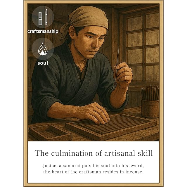 ・ハートノート 心地よくとろけるバニラウッドが加わり、武士道の中に芽生える慈愛や温もりを表現。長時間の焚香でも重くならず、安心感を与えます。