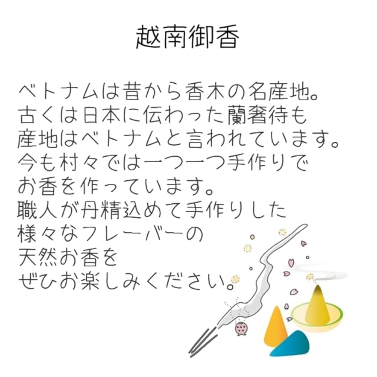 世界有数の香木の産地としても有名なベトナム。古くは日本に伝わった蘭奢待も一説によるとベトナムから伝わったものだとか。 そんなベトナムではお線香やお香の生産もさかんで、様々なフレーバーのお香やお線香が楽しめます。