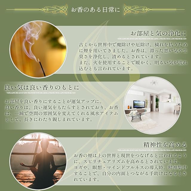 【お部屋の浄化に】古くから世界中で魔除けや厄除け、穢れを払うために煙を用いてきました。お香は、滞った悪い気や生臭さを浄化し、清めるとされています。 また、火を使用することで暖かく、明るい気が流れ込むとも言われています。
