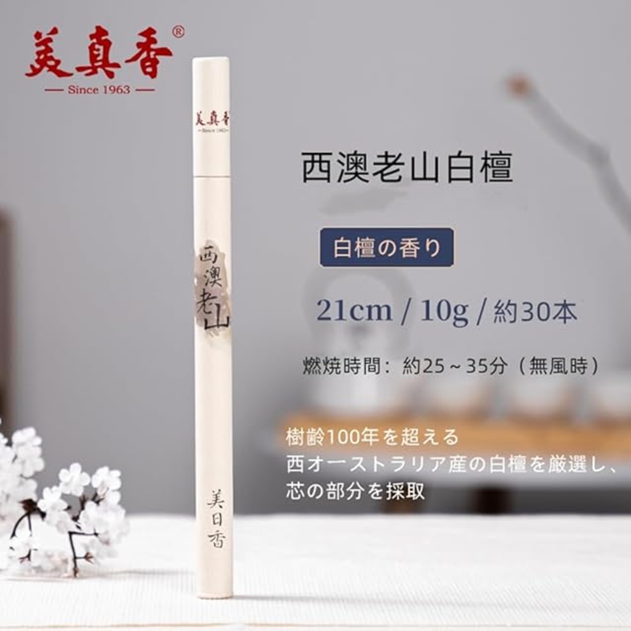 仕様:内容量:10g/約30本(21cm长) 燃焼時間:約25~35分(無風時) 効果: リラックス 素材:樹齢100年以上の西オーストラリア産白檀を厳選し、その芯の部分を使用し、大自然に育まれた香木は、古来より人の心をとらえ、高貴にして貴重なものとして、大切に扱われてきました。優美な気品高い香木「白檀」の香りと心打つ香りの響きをお楽しみください。 場所:ピアノ、囲碁、書道、絵画、お部屋や玄関、お仏壇用、神棚、ヨガや瞑想、座禅。 使用上の注意点: 天然だからこそ生産の都度、香りが多少変わることがございます。あらかじめご了承ください。 また、天然素材のため焚き初めは木の燃えるような香りがすることがあります。少し離れたところから漂ってくるほのかな香りをお楽しみください。 ご使用環境によって燃焼時間が異なります。火の取り扱いには十分ご注意ください。香立ては付属していません。あらかじめ、準備してからご使用ください。