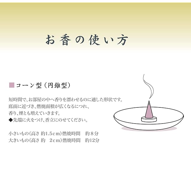 金色の紐をほどいて包みを開くとコーン型のお香と簡易香立が入っています。