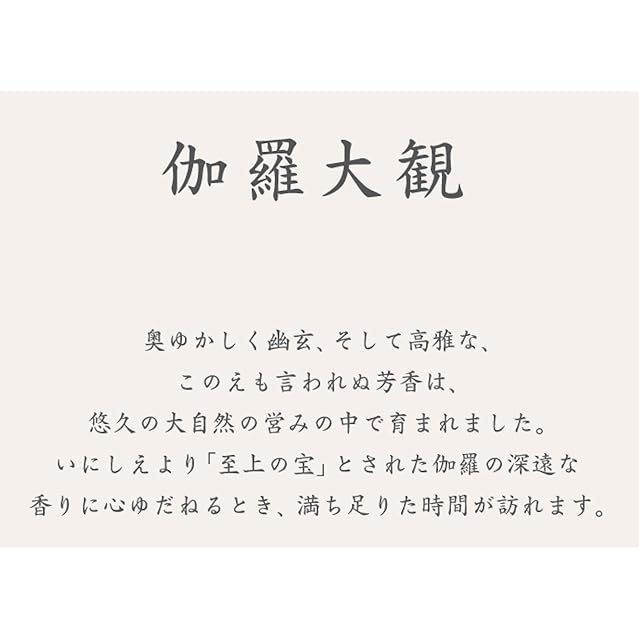 上質で辛み・深みのある沈香・伽羅をたっぷり用い、白檀・生薬系香料がさらにその魅力を高めます。