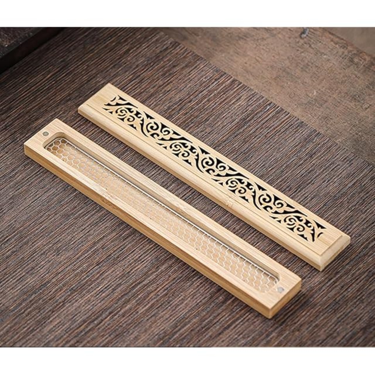 デザイン性: 伝統的な和風の透かし彫り模様が施された木製お香立て、3種類の異なる模様からお選びいただけます