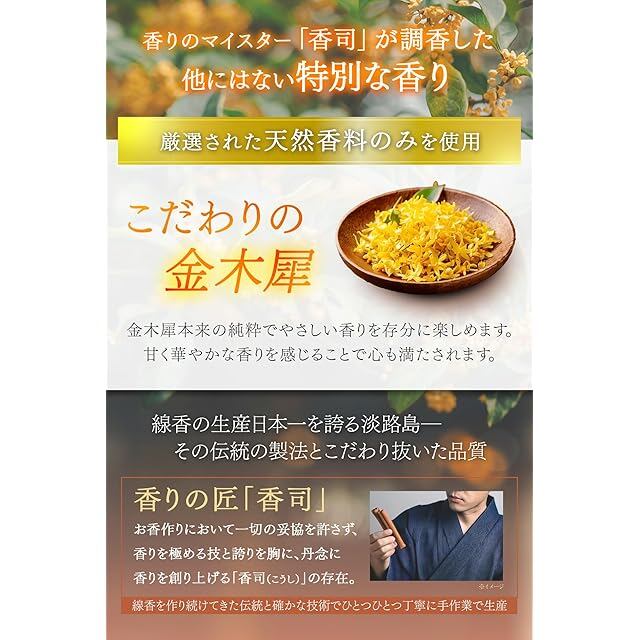 【秋風に香る甘くかぐわしい金木犀の香り】初秋の柔らかな風に乗って漂うほんのり甘い華やかな香り。金木犀香料を配合して自然な金木犀の香りを表現しました。華やかでフレッシュな香りから、時間経過とともに上品で少し甘みのあるフローラルノートが広がります。香りの移ろいが心地よい余韻を残してくれます。お線香やアロマの香りが苦手な方にもおすすめです。