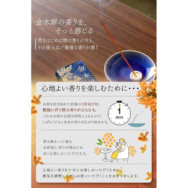 【お香の楽しみ方】 お香の焚きはじめは燃焼に伴う煙の香りが立ちますので、くゆりとともに煙の香りでお部屋や心を浄化しましょう。その後、品で少し甘みのあるの金木犀を想わせるような華やかな香りへの移ろいをお楽しみください。