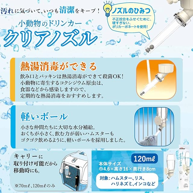 ●ケージ、サークルのワイヤー太さ:4mmまで、ワイヤー間:2.5cm(横目・縦目共通)までに取付できる小動物用ドリンカー。(対象:ハムスター、ハリネズミ、リス、インコなど)