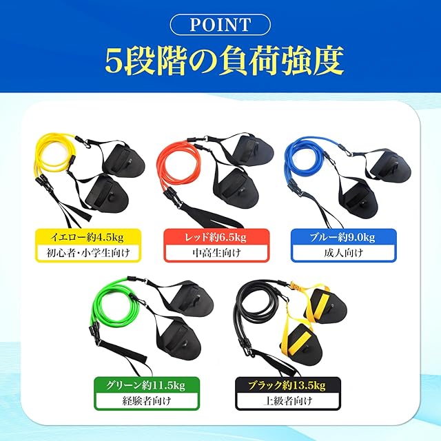 【商品名】 <br><br>商品ページをご覧頂き、誠にありがとうございます。 <br><br>水泳トレーニングを陸上で!パドル付きチューブです。高弾力のチューブとパドルで、肩まわりや腕の筋力を効果的に鍛えられます。自宅やジム、旅行先でも手軽にトレーニング可能! <br><br>【幅広いシーンで大活躍】水泳のフォーム練習や筋力強化に/肩や腕まわりの柔軟性アップに/小中学生のスイミング練習に/社会人・フィットネス愛好者の筋トレに/出張先や自宅でのトレーニング補助に <br><br>【持ち運びOK】壁やドアなど高所にストラップを設置し、パドルに手をはめ込むだけのシンプル構造。軽量かつ収納袋付きで、持ち運びもラクラク!屋内外、場所を問わずいつでもトレーニングに励むことができます。 <br><br>【5段階の負荷強度バリエーション】イエロー約4.5kg(初心者・小学生向け)/レッド約6.5kg(中高生向け)/ブルー約9.0kg(成人向け)/グリーン約11.5kg(経験者向け)/ブラック約13.5kg(上級者向け) <br><br>【商品詳細】セット内容:トレーニングチューブ×1、パドル×2、収納袋×1 カラー(負荷強度):イエロー(約4.5kg)、レッド(約6.5kg)、ブルー(約9.0kg)、グリーン(約11.5kg)、ブラック(約13.5kg) サイズ:全長約1.85m チューブの長さ約1.2m 素材:TPE <br><br>※モニターの環境により色の見え方に若干差が生じる場合がございます。