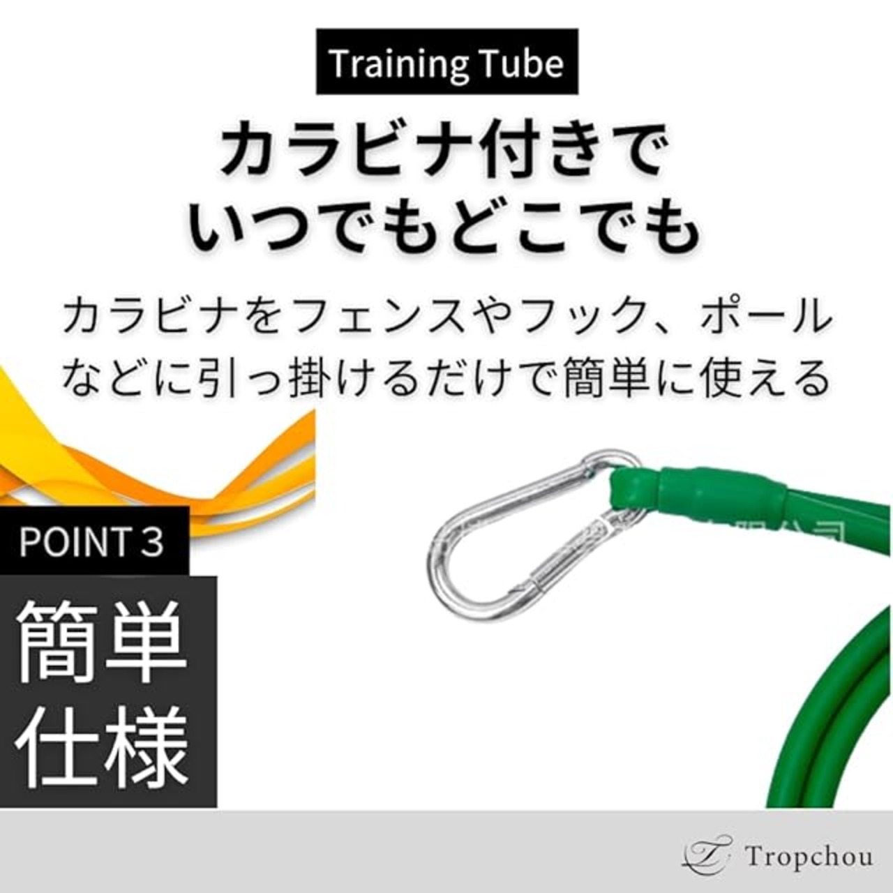 【カラビナ付きでいつでもどこでも】 チューブ本体に付いているカラビナを、フェンスやフック、ポールなどに引っ掛けるだけで簡単に使えます。場所を取ることもなく、省スペースでトレーニングできます。また、コンパクトサイズで収納袋付きなので、保管や持ち運びもしやすく、いつでもどこでも手軽にご使用いただけます。