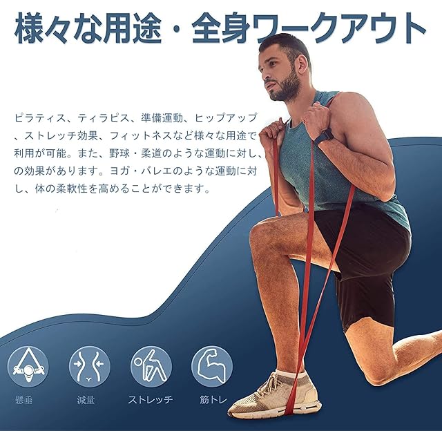 【5種類の強度】レッド(負荷レベル:約7-15kg)、 ブラック (負荷レベル:約15-30kg)、 パープル (負荷レベル:30-45kg)、 緑 (負荷レベル:45-70kg)、 青い (負荷レベル:70-90kg)の5種類。トレーニングに合わせて強度を選べる。