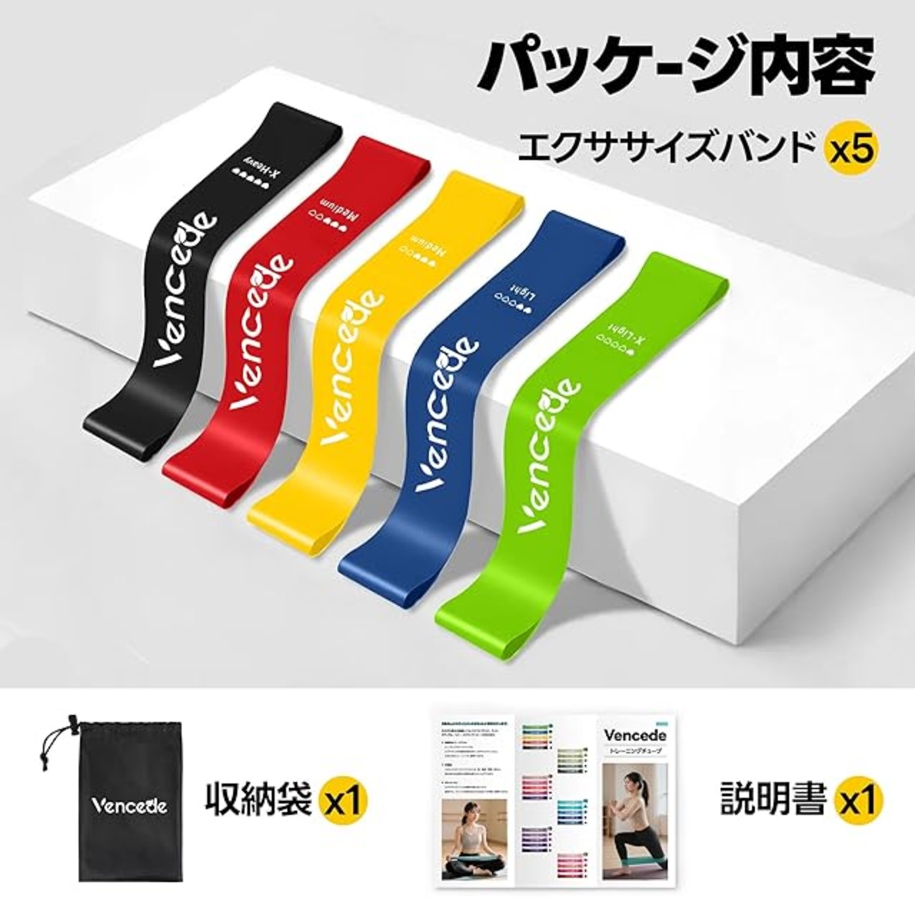 5段階の負荷で初心者から上級者まで対応:カラー別に異なる5種の強度,X-Light(最弱)-Light(弱)-Medium(普通)-Heavy(強)-X-Heavy(最強)を用意。組み合わせて使うことで、負荷は5kg〜59kgまで調整可能。自分の体力レベルやトレーニング目的に合わせて最適な強度で運動できます。