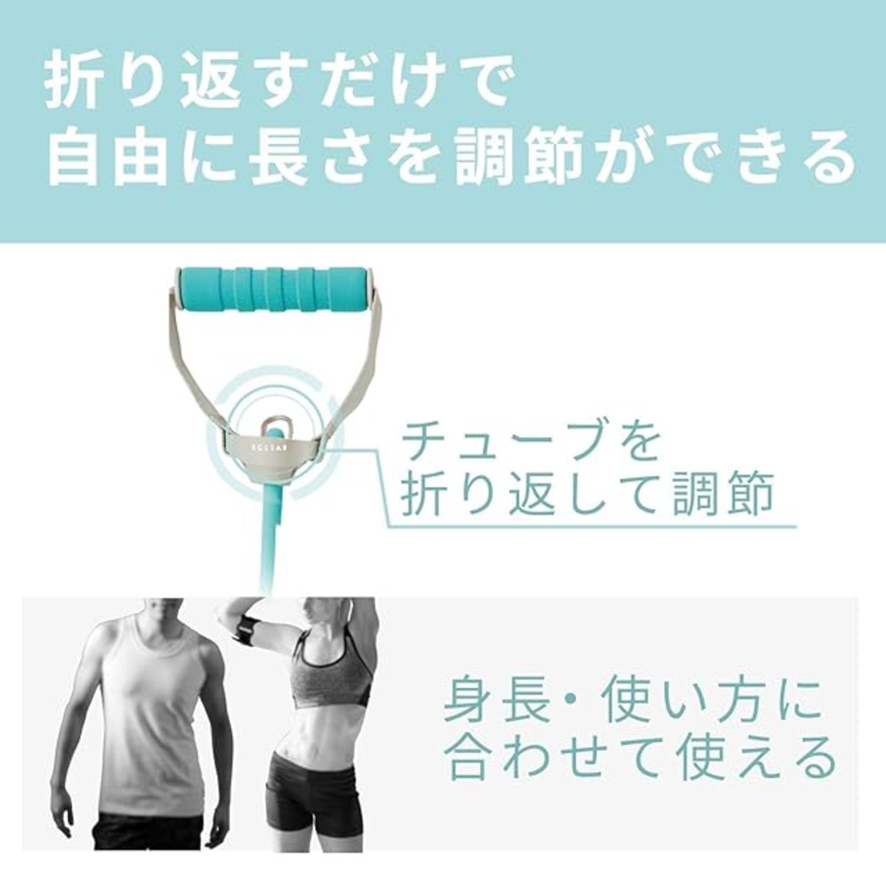 身長やトレーニング方法によって長さ調節ができるエクリア スポーツ“ハンドル付きチューブ”です。