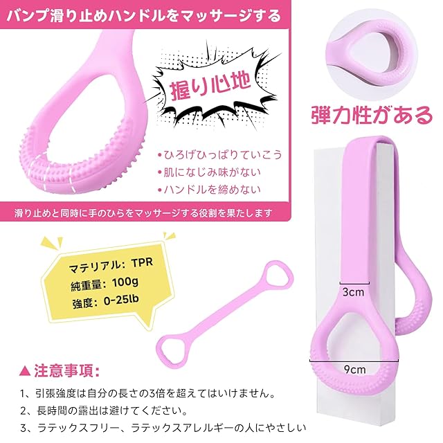 【製品設計】:製品は一体成型の設計で、耐久性があり、変形しない、厚みのある固体設計で、製品をより柔軟で伸縮可能にし、高い弾性引張力、3回伸縮、滑り止めチューブハンドル付き。 チューブハンドルの表面には細かい粒状の突起があり、汗をかいてもしっかりつかむことができる。