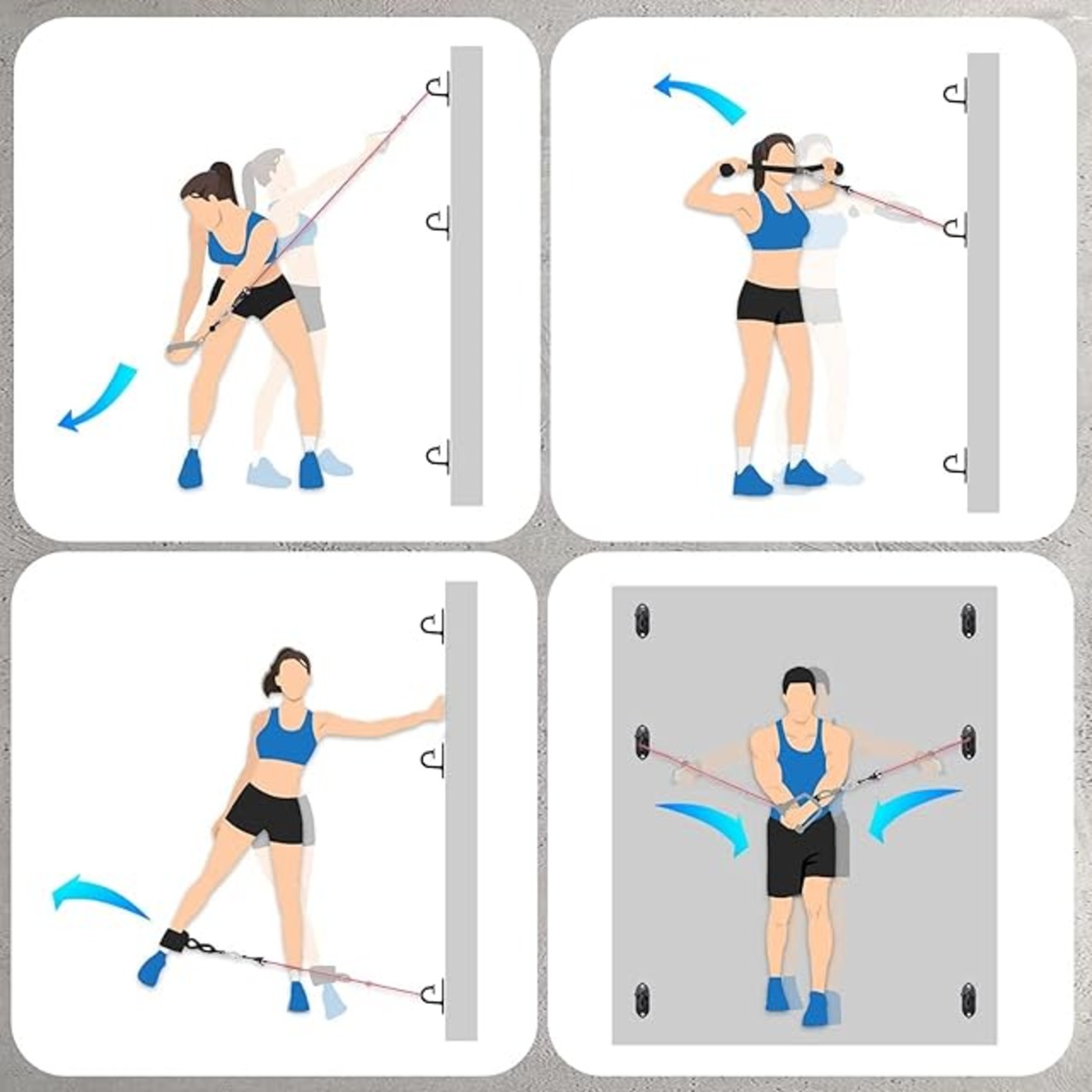 高さ調整可能--エクササイズアンカーの各セットには、異なる高さに設置できる抵抗バンドアンカーが3つ含まれており、脚、腹筋、胸、背中、肩、腕など、さまざまな体の部位をターゲットにしたフィットネス エクササイズを行うことができます。
