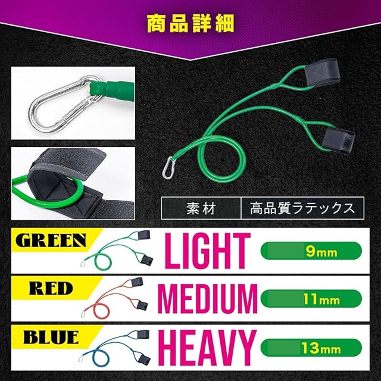 ■商品特徴<br> 自宅で手軽に本格的なトレーニングを始めたい方に最適なトレーニングチューブです。<br> 筋トレやストレッチ、ダイエット器具として多目的に活用でき、全身の筋力強化や柔軟性向上をサポートします。<br> 野球の筋力トーレニングで採用されており、これ一本で様々なトレーニングの組み合わせが可能です。 <br> 高品質なラテックス:耐久性と伸縮性に優れ、長期間の使用でも劣化しにくい設計です。<br> 多用途なトレーニング対応:筋トレ、ストレッチ、リハビリ、ダイエットなど、さまざまな目的で使用できます。<br> 省スペースでの保管と携帯性:軽量でコンパクトなデザインのため、自宅やオフィス、旅行先でも手軽にトレーニングが行えます。<br> このトレーニングチューブセットを活用して、日々のフィットネス習慣を充実させ、理想のボディを目指しましょう。<br> <br> ■カラー別負荷<br> グリーン Light 4x9mm<br> レッド Medium 6x11mm<br> ブルー Heavy 6x13mm<br> <br> ■使用方法<br> 以下のトレーニングで使用する際に最大限の効果を発揮します。<br> チューブプッシュアップ:胸部(大胸筋)を鍛えるのに効果的です。<br> チューブローイング:背中(広背筋)を鍛えるのに効果的です。<br> チューブスクワット:下半身(大腿四頭筋、ハムストリングス)を鍛えるのに効果的です。<br> チューブカール:腕(上腕二頭筋)を鍛えるのに効果的です。<br> チューブクランチ:腹部(腹直筋)を鍛えるのに効果的です。<br> <br> 上記のトレーニングを組み合わせで行う事で、全身の筋力強化や柔軟性の向上が期待できます。<br> 各エクササイズは15回を1セットとし、2〜3セット行うことをおすすめします。<br> トレーニング中は正しいフォームを維持し、無理のない範囲で行いましょう。<br> <br> ■注意事項<br> ・使用前に必ずチューブの劣化・破損がないか確認してください。<br> ・鋭利な物やザラついた場所での使用は避けてください。<br> ・急激な引っ張りや過度な負荷をかけないでください。<br> ・濡れた状態や湿度の高い場所での保管・使用は避けてください。<br> ・使用中は周囲に人や物がない安全なスペースを確保してください。<br> ・乳幼児やペットの手の届かない場所に保管してください。<br> ・高温になる場所や直射日光の当たる場所には保管しないでください。<br> ・本来の用途(運動・トレーニング)以外には使用しないでください。<br>