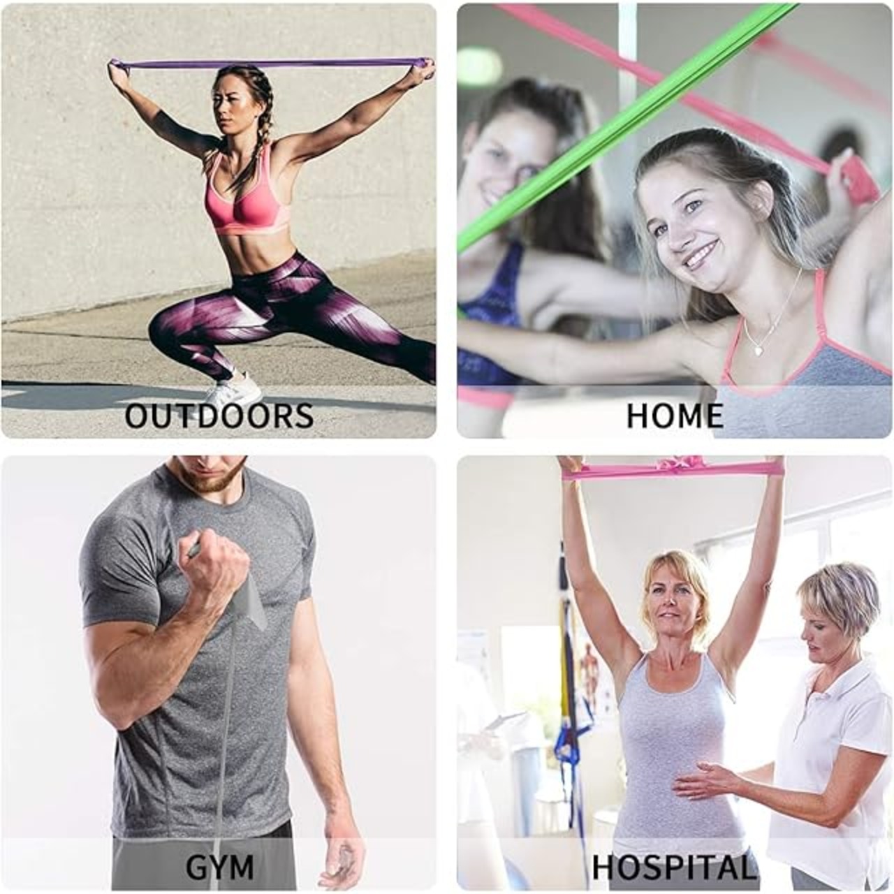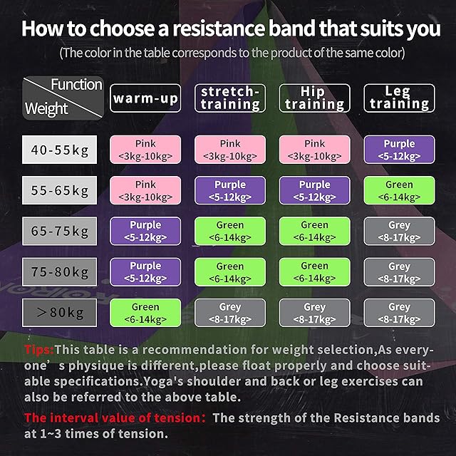 【さらに多数の選択肢】本社のエクササイズ バンド、より幅広くデザインされるので、ご使用中にはより快適を感じられる。1.5m×15cmの標準版だけでなく、2m ×15cm延長版もあります。異なる色には異なる張力値があります。ピンク、紫、緑、グレ-四つの色に対応する張力値は逐次的に増加し。さまざまな張力値がさまざまなスポーツや身体の部分に適用されます。力及び運動の種類に応じて、最大引き延ばす強度は、3倍です。ストレッチバンドは腕、肩、尻、足、脚、腹などの体の各部位を鍛えるのにも効果的です。スポーツやトレーニングに効いて、筋肉訓練にも簡単にできるようになります。 初心者の方又は初めてのストレッチを行うと、少し難しいかもしれません。それはだんだん練習により、エクササイズの引張強度とレベルを上げる必要があります。運動が少しずつ向上すると、次のレベルの色に選択することができます。トレーニングレベルを徐々に向上させるために、2つ以上またはセットを購入することをお勧めします。