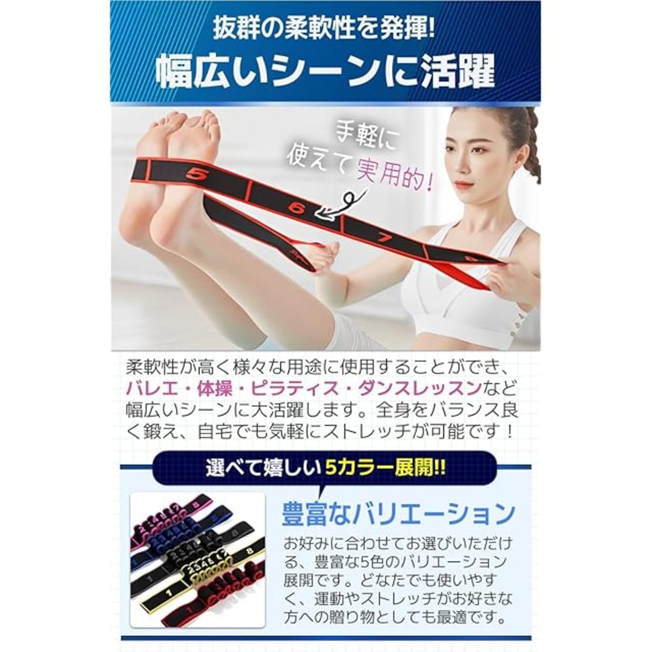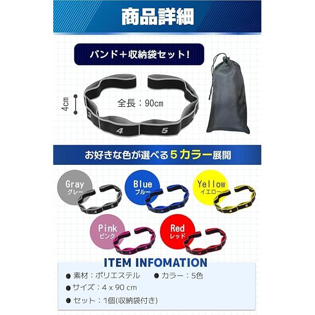 【商品特徴】①嬉しい収納袋付き:持ち運びに便利な収納袋がセットに!/②抜群のストレッチ性:高クオリティのエクササイズを実現/③劣化がしにくい素材:高耐久のポリエステルで変形がしにくい!/④ギフトにもおすすめ:ヨガや運動がお好きな方への贈り物に