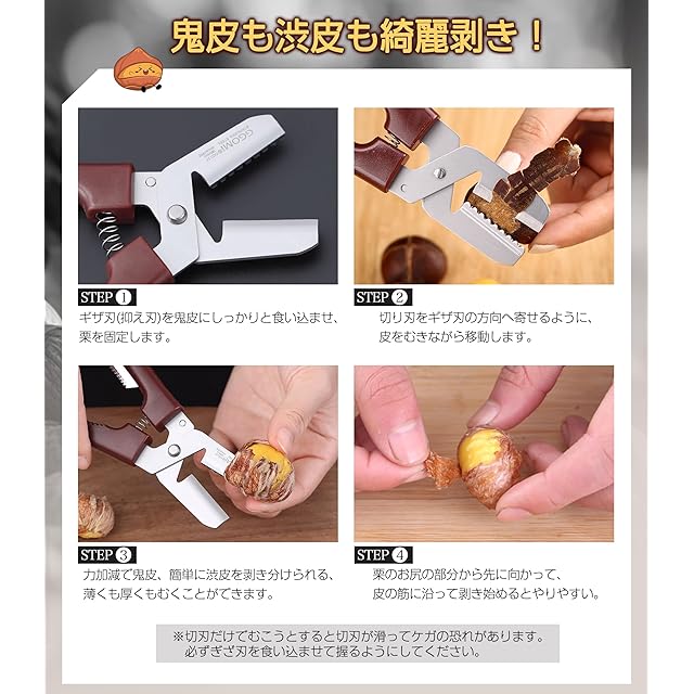 ✅【栗皮むき方】※切刃だけでむこうとすると切刃が滑ってケガの恐れがあります。必ずぎざ刃を食い込ませてにぎるようにしてください。ギザ刃(抑え刃)を鬼皮にしっかりと食い込ませ、栗を固定します。切り刃をギザ刃の方向へ寄せるように、皮をむきながら移動します。栗の鬼皮と渋皮が一緒につながって切れます。栗のお尻の部分から先に向かって、皮の筋に沿って剥き始めるとやりやすく、2~3個むいて慣れてくると、力加減で鬼皮、簡単に渋皮を剥き分けられる、薄くも厚くもむくことができます。