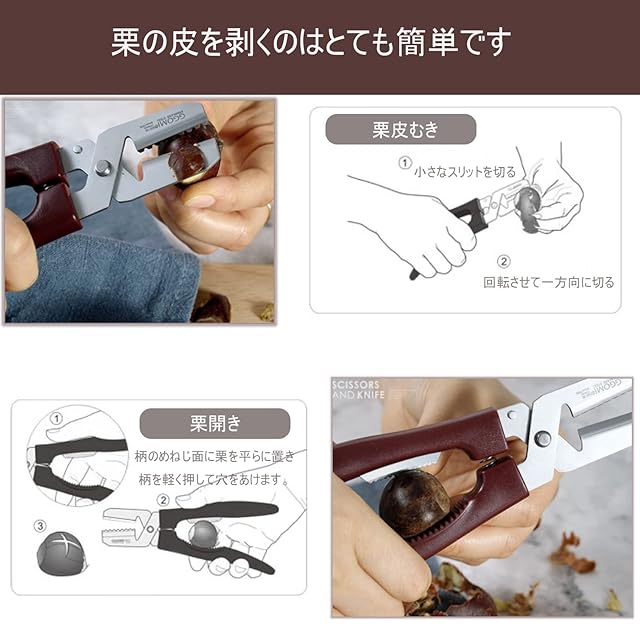 【栗むき鋏】栗はとてもおいしくて栄養価の高い食べ物ですが、栗の皮をむくのは非常に面倒な手作業でした。 これは、栗の試食体験にな影響を与えます。 多機能な「栗むき器」が登場! 栗の皮と開栗の口をはがす専用しいツールです。